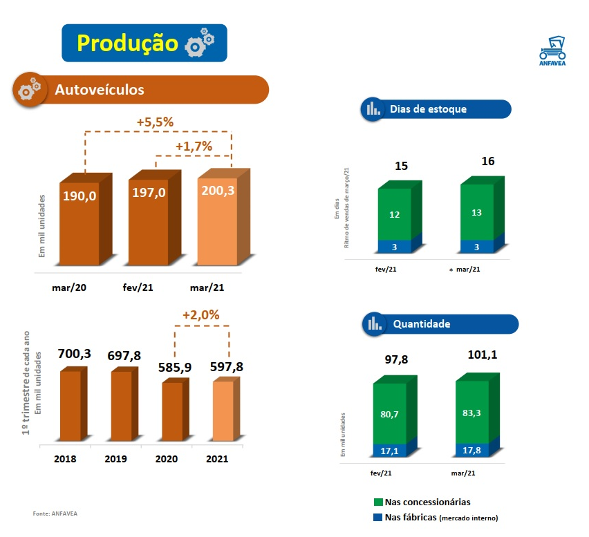 No mês de março o agravamento da pandemia e a falta de peças, afetaram a produção de 14 montadoras, mesmo com todos os desafios a produção subiu no trimestre em 5,5%, número ainda insuficiente para atender a demanda represada, principalmente das locadoras.