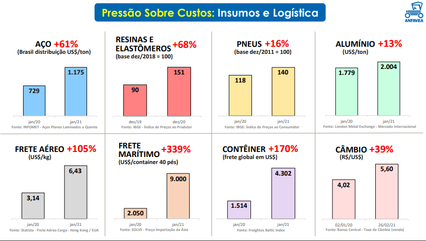 Outro problema que o segmento enfrenta é o aumento de custos, dados da Anfavea demonstram que o aço subiu 61% nos últimos 12 meses, pneus 16%, frete aéreo 105%, frete marítimo 339%, o reflexo é aumento de preços para o consumidor final, reavaliação de produtos, reengenharia financeira, redirecionamento de futuros investimentos.