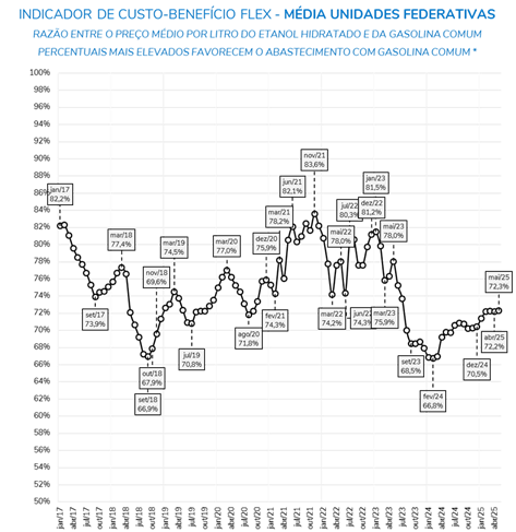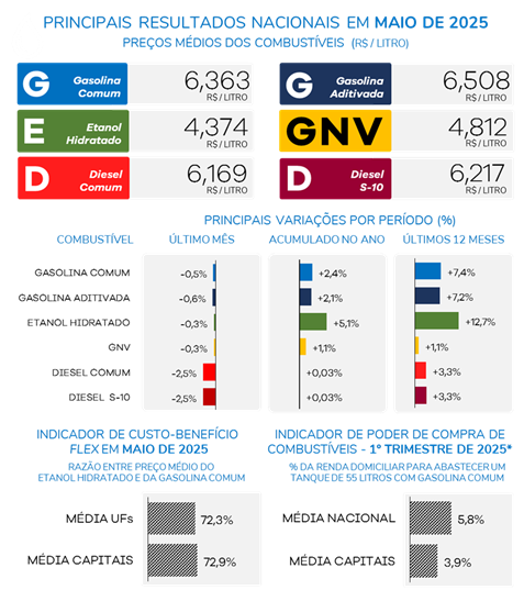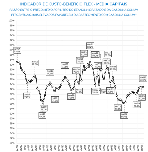De acordo com o Indicador de Custo-Benefício Flex, em maio de 2025, o preço médio do etanol correspondeu a 72,3% do valor da gasolina comum no cenário nacional e 72,9% na média das capitais, o que, considerando o rendimento dos combustíveis, favoreceu a escolha pela gasolina em diversas regiões.
