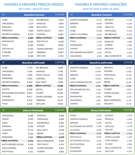 O etanol foi comercializado a R$ 4,374, com destaque para os preços no Norte (R$ 5,280) e Nordeste (R$ 4,916). Em relação a abril, as maiores quedas de preço ocorreram no Sudeste (-0,9%) e Sul (-0,7%).