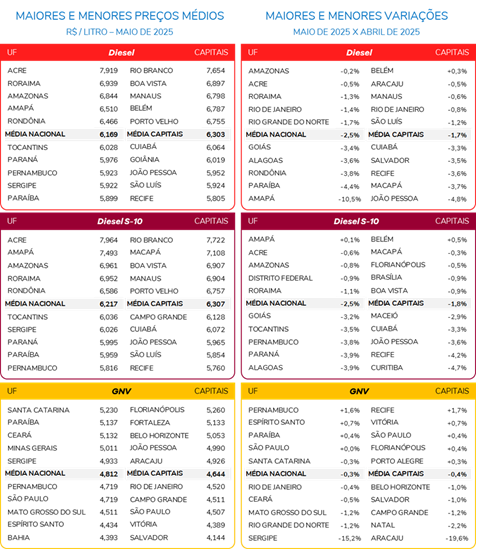 No acumulado de 2025 (até maio), quatro dos seis combustíveis apresentaram elevações nos respectivos preços médios nacionais, com destaque para etanol (+5,1%), à frente da gasolina comum (+2,4%), gasolina aditivada (+2,1%) e GNV (+1,1%). Já os preços do diesel comum e do S-10 seguem praticamente estáveis no ano (+0,03%).