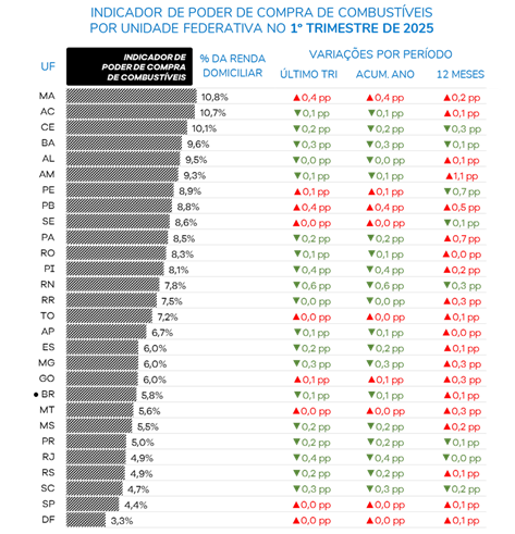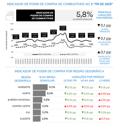 Os resultados do Indicador de Poder de Compra também evidenciaram desigualdades regionais importantes, especialmente em termos da renda e do poder aquisitivo das famílias. Em relação à média nacional (5,8%), por exemplo, a proporção da renda domiciliar mensal necessária para custear o mesmo volume de gasolina nas capitais foi comparativamente menor (3,9%). Importante ressaltar que o consumo de combustível também pode ser maior nos grandes centros urbanos, o que pode acabar neutralizando essa vantagem na esfera da renda.