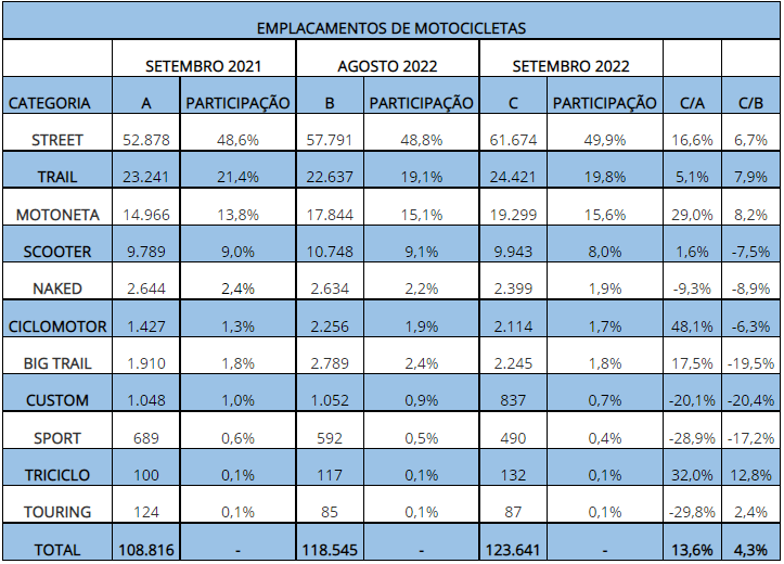 Com 61.674 unidades e 49,9% de participação no mercado, a   Street foi a categoria mais licenciada em setembro. A Trail ficou em segundo lugar (24.421 motocicletas e 19,8% dos emplacamentos), seguida pela Motoneta (19.299 unidades e 15,6%).