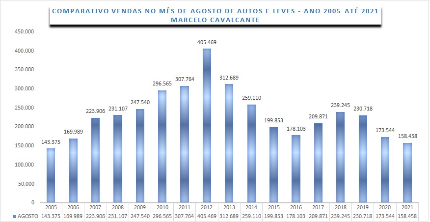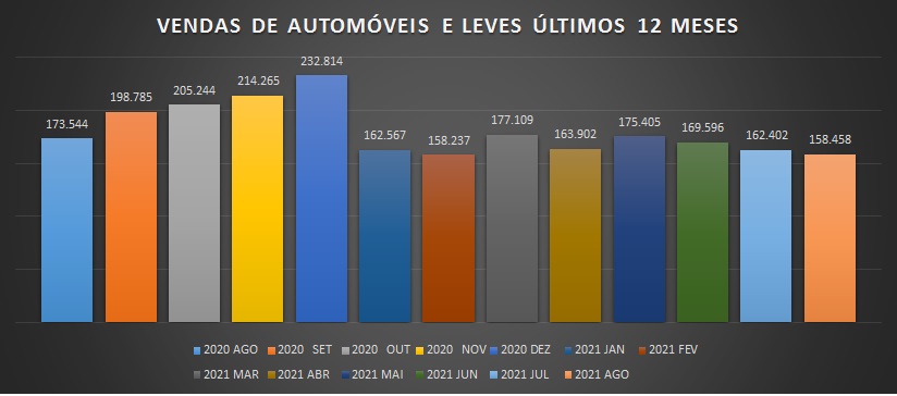 A crise dos semicondutores continua a limitar o crescimento do setor de automóveis e comerciais leves, no mês de agosto foram vendidos 158.458 unidades, registrando uma queda em relação ao mês anterior de 2,43%, é o menor volume de vendas registrado no mês de agosto desde o ano de 2005.