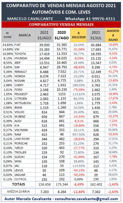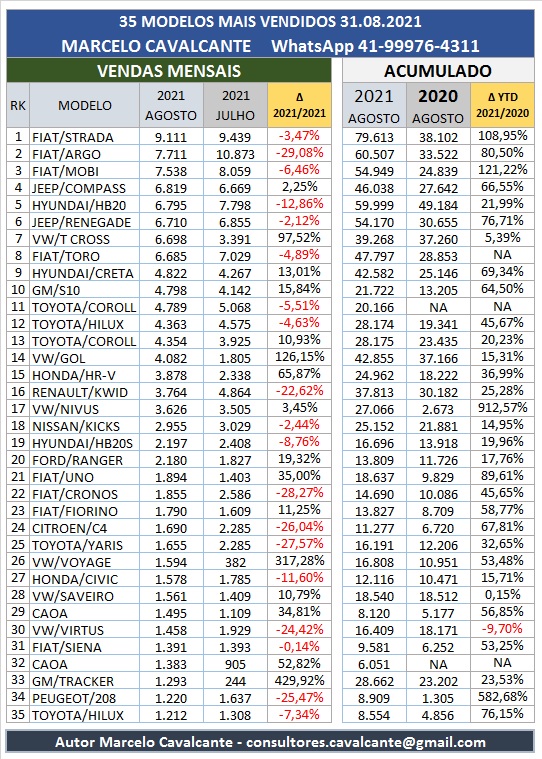 No ranking de vendas mensais de agosto fica evidenciado a dificuldade das montadoras em acelerar a produção, entre as marcas de volume seis fábricas registraram quedas nas vendas em relação ao mês anterior, o retorno parcial da produção da unidade da GM de Gravataí só deverá ter seus reflexos no mês de setembro, mas com certeza teremos novas paralisações no mês corrente.