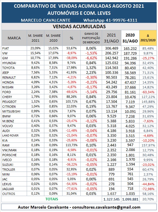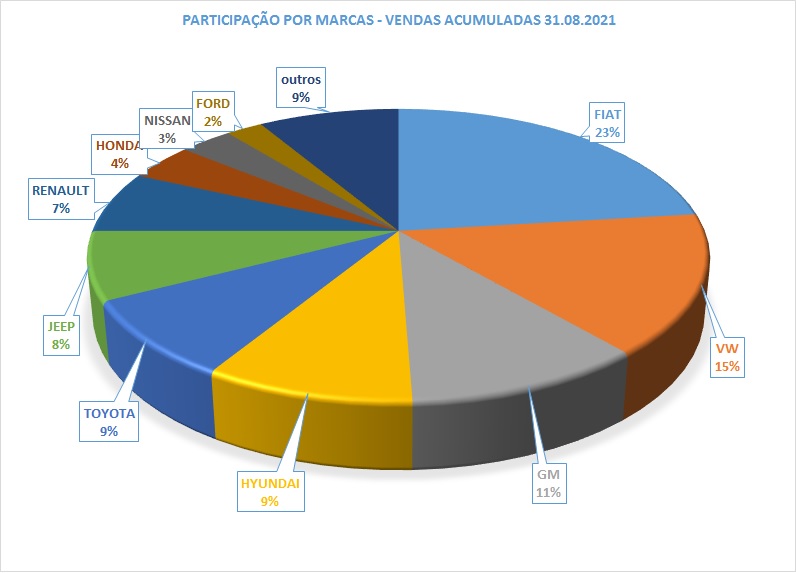 A liderança nas vendas acumuladas é disparada da Fiat, sua participação de mercado está em 23,06%, seu crescimento de Market Share nesses oito meses equivalem as vendas somadas da Nissan, Ford, Chery e Mitsubishi, seu volume de vendas acumula um crescimento em relação ao ano anterior de 85,48%, a diferença para o segundo colocado é de 100.212 unidades, pelos dados atuais equivalem a 4 meses de vendas da VW.