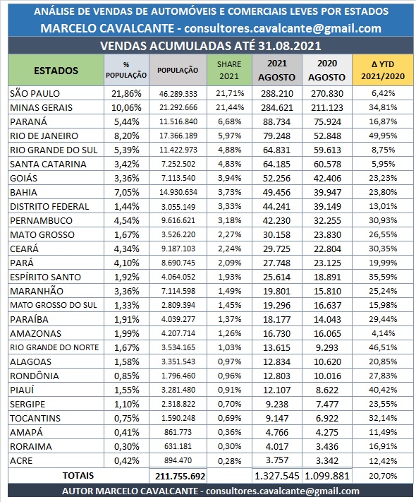 O Estado de São Paulo segue liderando as vendas acumuladas de automóveis e comerciais leves, mas pelo segundo mês consecutivo suas vendas mensais são superadas por Minas Gerais, foram vendidos no mês em São Paulo 33.737 veículos, a Fiat liderou as vendas no Estado com 5.700 unidades, seguida pela VW com 5.294 e fechando o trio do mês a Toyota com 3,380 veículos. Suas vendas acumuladas totalizaram em agosto 270.830 unidades, com uma participação de 21,86%, a marca que mais vendeu no acumulado foi a VW com 48.050 unidades, seguida pela Fiat com 42.970 e fechando o trio dos paulistas a Hyundai com 33.220 unidades vendidas.