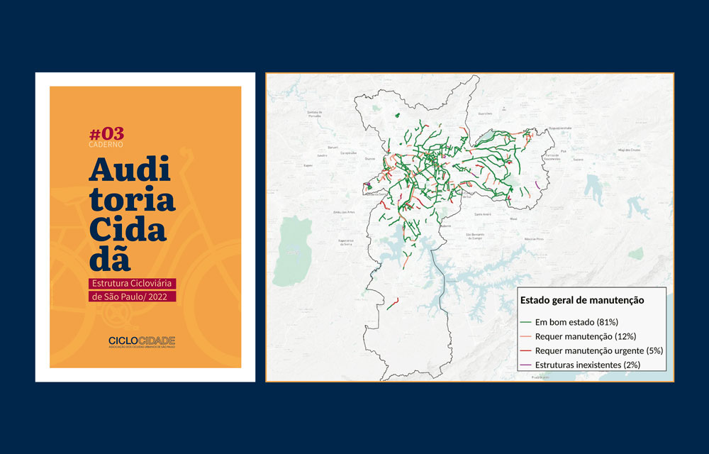 A Ciclocidade lançou neste sábado, 25 de junho, o caderno “Auditoria Cidadã 2022 da Estrutura Cicloviária de São Paulo”, resultado de uma pesquisa de campo realizada em toda a rede da cidade de São Paulo com o objetivo principal de fornecer insumos para que a Companhia de Engenharia de Tráfego (CET) e a Secretaria de Mobilidade e Trânsito (SMT) possam priorizar a manutenção dos pontos considerados críticos. O trabalho contou ainda com um mapeamento de todos os paraciclos ao longo da rede e teve apoio do Instituto Clima e Sociedade (iCS) e da Eureka Coworking.
