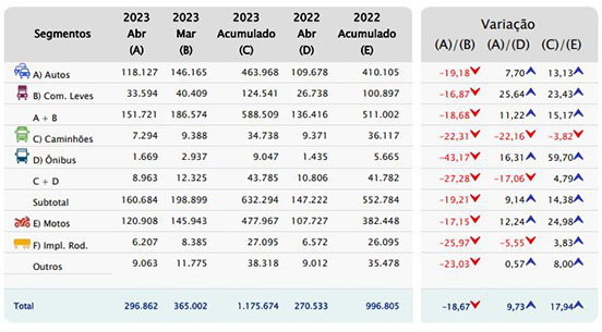 Já no acumulado de 2023 sobre 2022, ainda que diante de uma base baixa, já que, no ano passado, havia falta acentuada de componentes na indústria, os emplacamentos de veículos tiveram alta de quase 18%. Se comparados os meses de abril 2022 e abril 2023, houve aumento de 9,7%.