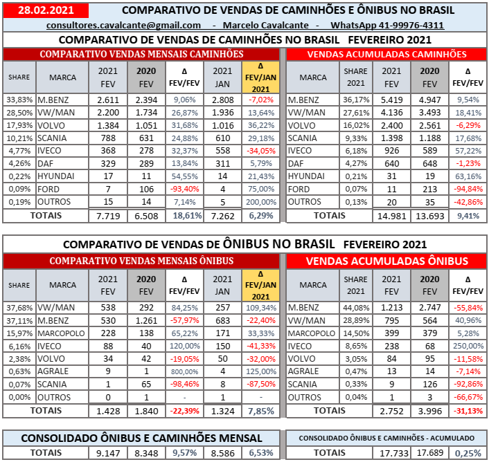 Confira abaixo o comparativo de vendas de caminhões e ônibus no Brasil referentes ao mês de fevereiro de 2021