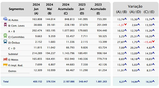 Os emplacamentos de veículos refletiram o impacto do crédito mais abundante e melhor índice de confiança por parte dos consumidores e empresários, apresentando alta, tanto em junho como no acumulado do 1º. Semestre de 2024.