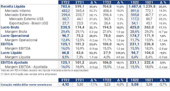 Com relação aos dados do segundo trimestre de 2022, a receita foi de R$ 782,6 milhões, o que representa 30,6% de crescimento na comparação com o ano passado. O EBITDA atingiu R$ 125,1 milhões, 23,6% maior que o mesmo trimestre do ano passado, com margem de 16%.