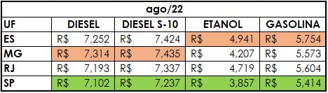 O último levantamento do Índice de Preços Ticket Log (IPTL) apontou que a Região Sudeste fechou agosto com o litro da gasolina a R$ 5,59, valor 9,63% mais barato, se comparado a julho; e o etanol, a R$ 4,43, com recuo de 9,57%. Ambos os combustíveis fecharam o período com o preço abaixo da média nacional, que foi de R$ 5,75, para a gasolina; e R$ 4,95, para o etanol. O diesel na região foi comercializado a R$ 7,21 o tipo comum e R$ 7,36 o S-10, com redução de 4,56% e 4,42% respectivamente. Os dois tipos de diesel também registraram valor abaixo da média nacional, que foi de R$ 7,41 e R$ 7,51, respectivamente.
