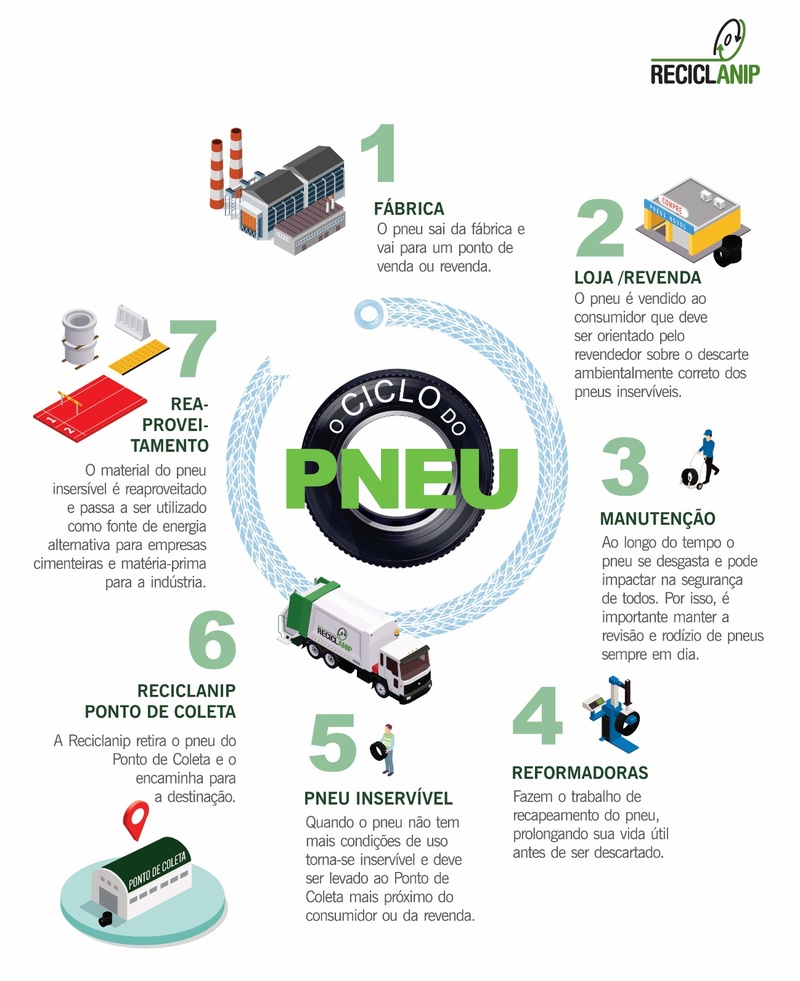 Esse trabalho realizado pela Reciclanip tornou o Brasil um exemplo para o mundo na logística reversa dos pneus. O resíduo é coletado e destinado para empresas homologadas pelos órgãos públicos competentes, que transformam os pneus inservíveis em outros materiais para o reaproveitamento.