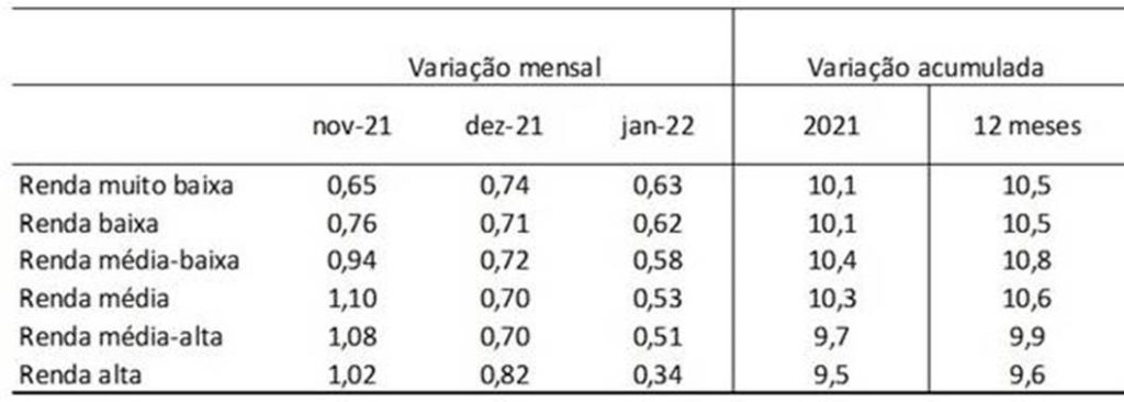 No acumulado em 12 meses, as famílias de renda média baixa tiveram a maior alta inflacionária, uma taxa de 10,8%, um pouco superior à registrada pela faixa de renda muito baixa (10,5%) e acima da faixa de renda alta (9,6%).