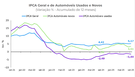 Em setembro, a inflação medida pelo IPCA desacelerou em relação a junho. No setor automotivo, o Programa Carro Sustentável influenciou na queda da inflação de veículos novos. Já a inflação de carros usados permaneceu relativamente estável, com 1,44% em setembro.