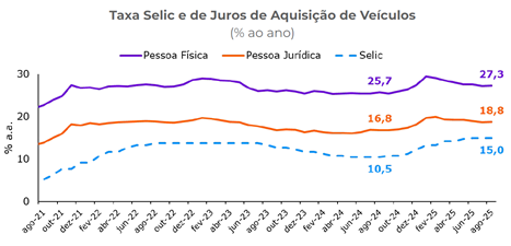 Os juros para financiamento de veículos se encontram em patamares superiores ao do ano passado, apesar de quedas recentes nas taxas para pessoas físicas e jurídicas. Isto se relaciona principalmente ao valor da Selic, em 15% desde setembro de 2024.