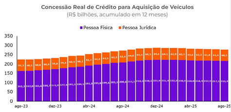 A concessão de crédito real para a compra de automóveis começou a apresentar redução em março para pessoas físicas e em fevereiro para jurídicas. No comparativo com dezembro de 2024, houve recuo de 2,5% e 6,5% em agosto para os dois perfis, respectivamente.