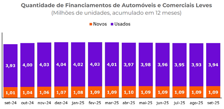 Os financiamentos de automóveis e comerciais leves concedidos de janeiro a setembro de 2025 caíram 2,1% em comparação ao mesmo período de 2024. Por outro lado, os financiamentos de veículos novos subiram 2,7%, enquanto os de veículos usados caíram 3,2%.