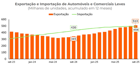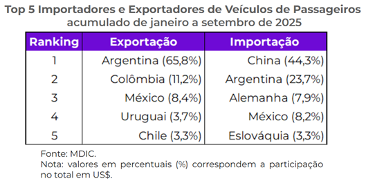 Segundo o estudo, após um ano e meio de saldos negativos no comércio de veículos de passageiros com outros países, voltamos a ter superávit no resultado acumulado em 12 meses em agosto e setembro deste ano. A principal explicação para a reversão do déficit é o elevado crescimento das vendas para a Argentina.