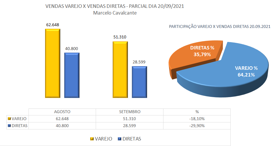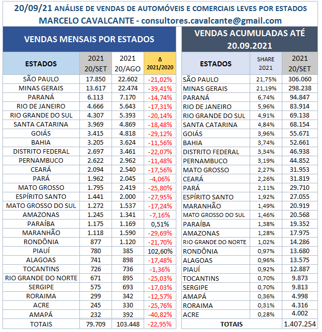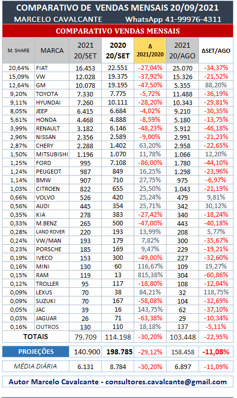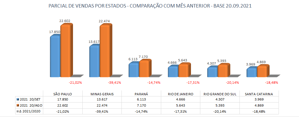A média de vendas na parcial está 11,08% abaixo do mês anterior, projetando um volume total para o mês de setembro entre 138.700 mil até 140.900 unidades, queda de 29,12% em relação ao mesmo período do ano anterior, existe uma demanda represada principalmente das locadoras que se for parcialmente atendida poderá melhorar muito esse cenário, mas depende da possibilidade de algumas montadoras conseguirem regularizar a produção de alguns modelos.