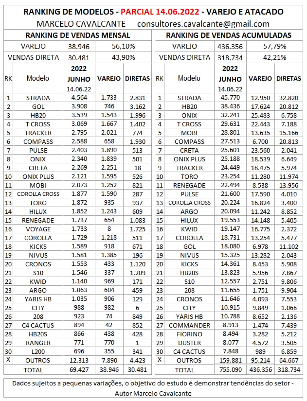 A liderança de vendas na parcial do mês de junho continua sendo da Fiat, com um desempenho acima da média dos seus principais concorrentes. Apesar disto, houve queda de 19,36% se comparado com o ano passado, e 10,94% ante o mês anterior. Seu marketshare é de 22,05%  em 2022. Estes números são puxados pelo modelo Strada, que teve um crescimento nas vendas de 7,01% em relação ao mês anterior, com 4.564 unidades comercializadas.