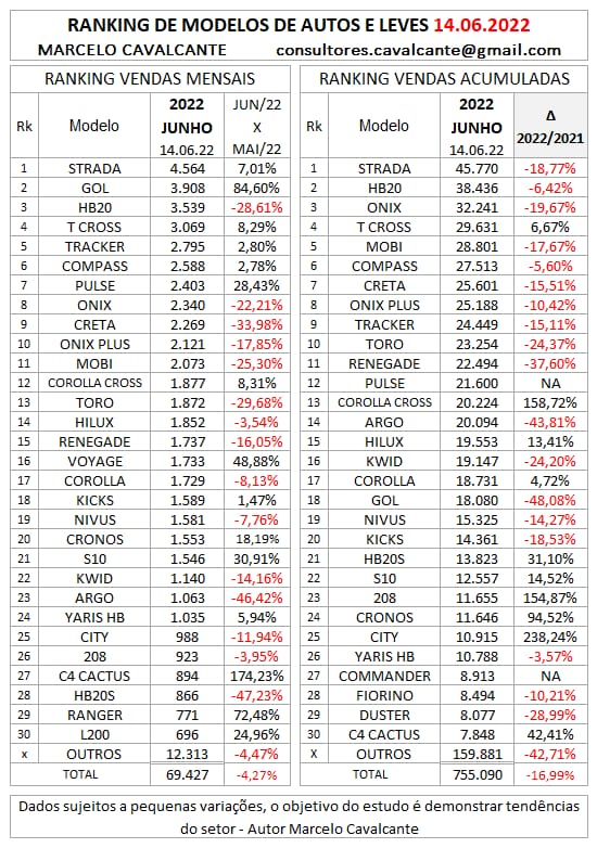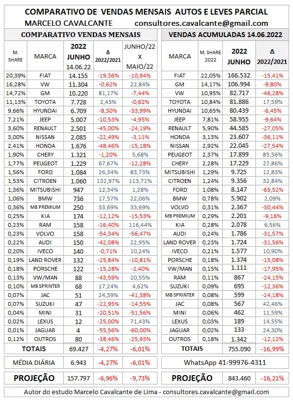 Parcial de vendas de automóveis e comerciais leves até 14 de junho