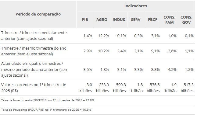O PIB totalizou R$ 3,0 trilhões no primeiro trimestre de 2025, sendo R$ 2,6 trilhões referentes ao Valor Adicionado a preços básicos e R$ 431,1 bilhões, aos Impostos sobre Produtos líquidos de Subsídios. No mesmo período, a taxa de investimento foi de 17,8% do PIB, acima dos 16,7% do primeiro trimestre de 2024. Já a taxa de poupança foi de 16,3%, superando os 15,5% do mesmo trimestre de 2024.