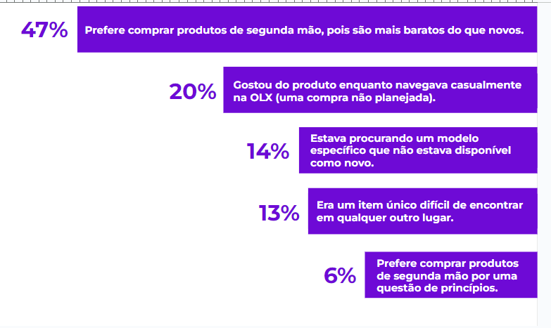Do total de respondentes, 76% encontraram o que procuraram, e 69% já fizeram compras na OLX. Dos que já adquiriram algo de segunda mão por meio da plataforma, a maioria (47%) o fez em razão do preço mais econômico dos usados.