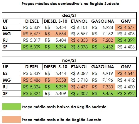 Já os postos paulistas apresentaram o menor preço médio do país para o etanol, a R$ 5,078. Entre os quatro Estados da Região, São Paulo também se destacou com as menores médias para o diesel comum e o S-10, para a gasolina e para o etanol, a R$ 5,309, R$ 5,394, R$ 5,078 e R$ 6,432 respectivamente. O etanol apresentou um recuo de 4,22% em relação a novembro.