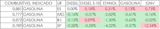 O diesel e o diesel S-10 foram comercializados pelo maior preço médio no Estado de Minas Gerais, a R$ 5,477 e R$ 5,554, respectivamente. O Espírito Santo não apresentou recuo em nenhum dos combustíveis, e sim, altas de até 0,31%.