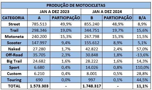 As motocicletas de média cilindrada registraram o maior crescimento porcentual: alta de 25,9% na comparação com 2023. No total, foram produzidas 327.746 unidades, o que representa 18,7% do total fabricado.