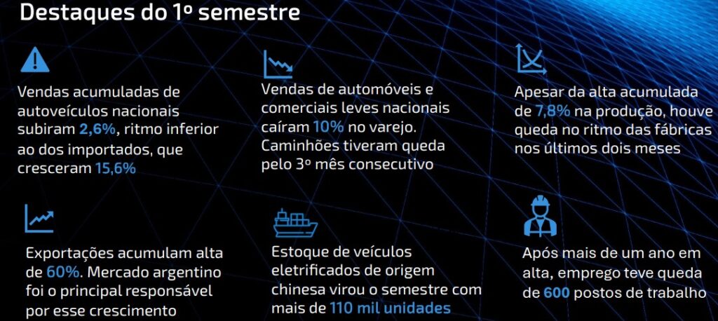 Pior: as vendas de veículos leves nacionais caíram 10% no varejo, na comparação com o primeiro semestre de 2024, enquanto modelos vindos da China representaram 6% do mercado brasileiro. Há mais de 110 mil veículos chineses em estoque no país. A média diária de vendas em junho foi inferior à do mesmo mês do ano passado, um recuo comparativo que não ocorria há quase dois anos no país.