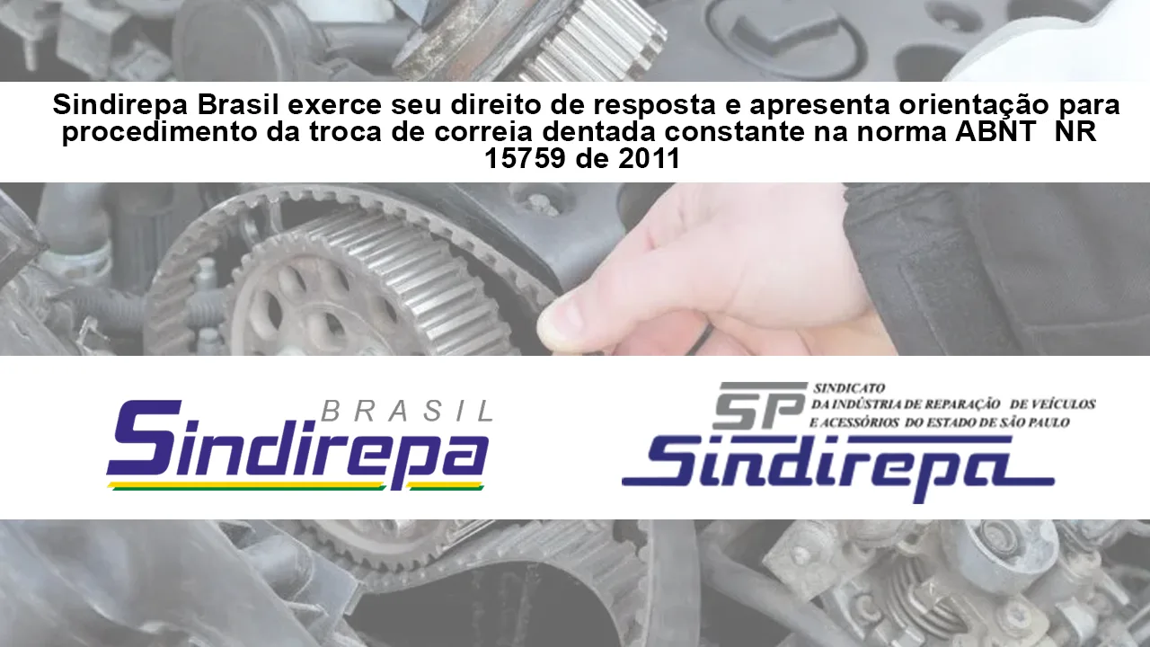 O Sindirepa Brasil repudia práticas que lesem os consumidores e recomenda aos reparadores, que os serviços sigam as normas ABNT. A entidade já publicou dezenas de normas para padronização de reparos, indicando os procedimentos corretos. No caso específico da troca da correia dentada, a norma ABNT é a NR 15759: 2011.