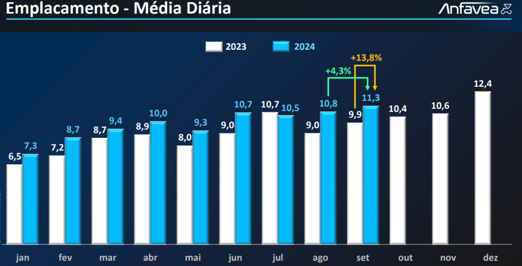 O volume de vendas de modelos importados é o maior desde 2014, assim como a participação de 17,3% no ano. Acrescentando aos emplacamentos o elevado volume importado da China ainda em estoque, a quantidade de veículos trazidos de outros países ao longo deste ano totaliza cerca de 400 mil unidades “Os resultados de setembro refletem a resiliência da nossa indústria e o aquecimento do mercado interno, que vem superando nossas expectativas. A média diária de vendas de setembro é um indicativo positivo de que o último trimestre pode trazer ainda mais crescimento”, afirmou Márcio de Lima Leite, Presidente da ANFAVEA, ressaltando que o ponto de atenção é o volume de exportações menor que o das importações.