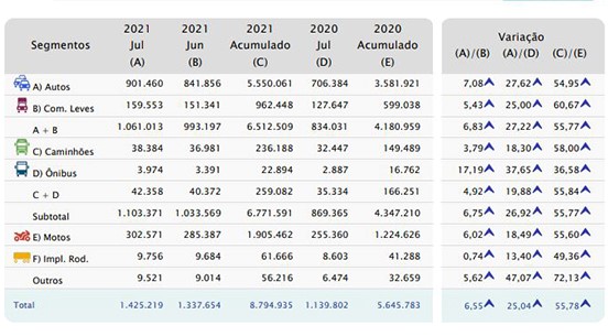 Isso porque, em julho, as transações tiveram alta de 6,55% sobre junho, totalizando 1.425.219 unidades. O acumulado no ano, por sua vez, atingiu, aproximadamente, 8,8 milhões de unidades – crescimento de 55,78% sobre o mesmo período de 2020. Em relação a julho de 2020, a alta foi de 25,04%.