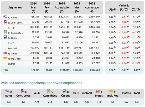 • As transações de automóveis e comerciais leves tiveram alta de 2,8% ante fevereiro, mas queda de 9,5% sobre março de 2023 – lembrando que março do ano passado teve três dias úteis a mais que em 2024 (23 a 20). No acumulado do ano, a alta dos segmentos chegou a 5,2%, demonstrando o bom desempenho do setor.