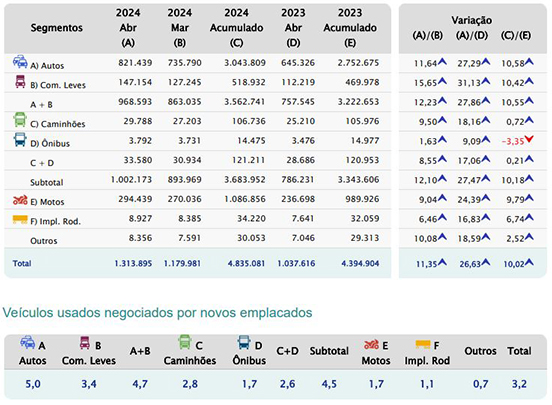 Segundo levantamento da FENABRAVE – Federação Nacional da Distribuição de Veículos Automotores, em abril, as transações de usados tiveram o melhor resultado do ano até o momento, com um total de 1.313.895 unidades, alta de 11,3% sobre março e de 26,6% sobre o mesmo mês do ano passado. No quadrimestre, a evolução acumulada é de 10%.