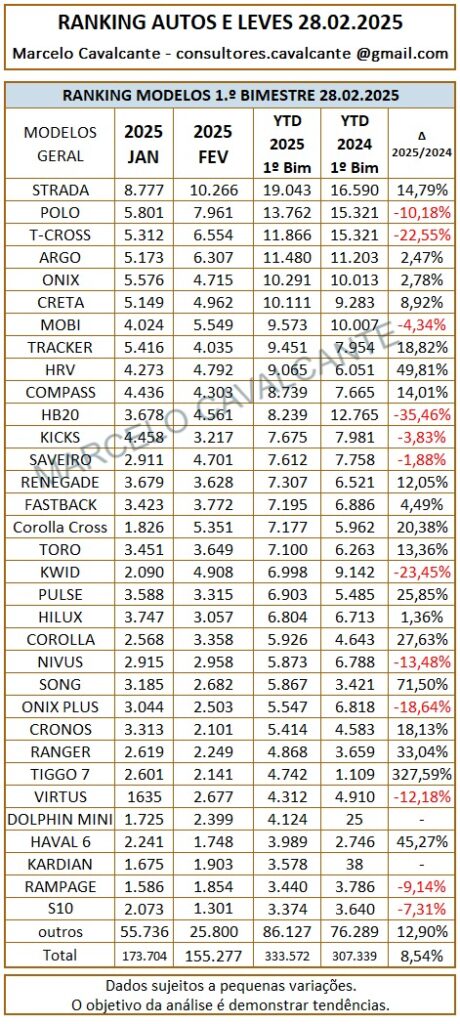 As vendas de automóveis e comerciais leves encerraram o mês de fevereiro com 173.704 unidades, esse volume representa um crescimento de 11,87% em relação ao mesmo período de 2024 e um avanço de 8,65% ante o mês anterior.