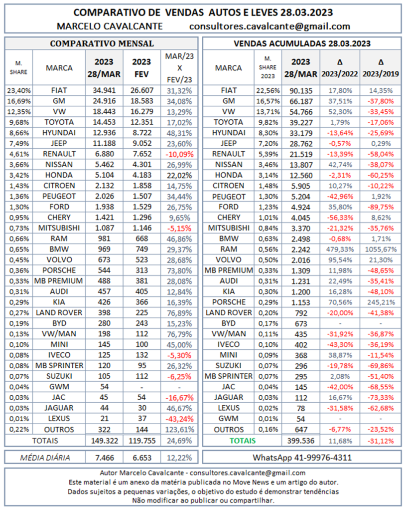 A Fiat segue sendo o destaque, a marca abre quase 24 mil veículos de vantagem no acumulado, suas vendas no mês anotam um crescimento de 31% ante o fechamento de fevereiro, seu volume total avança 17,80% em relação ao ano anterior e 14,35% quando comparado com o período pré-pandemia. Temos que relembrar que a marca encerrou o 1º trimestre de 2019 com uma participação de mercado de 13,59% e deve encerrar o trimestre de 2023 com uma participação acima de 22,50%, o que representa um crescimento de 66%.