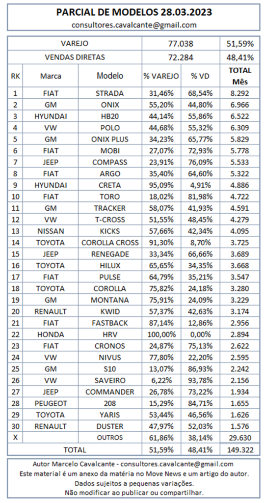 No final do artigo vamos dar uma parcial do ranking de modelos e uma parcial com comparativo do setor de motos.