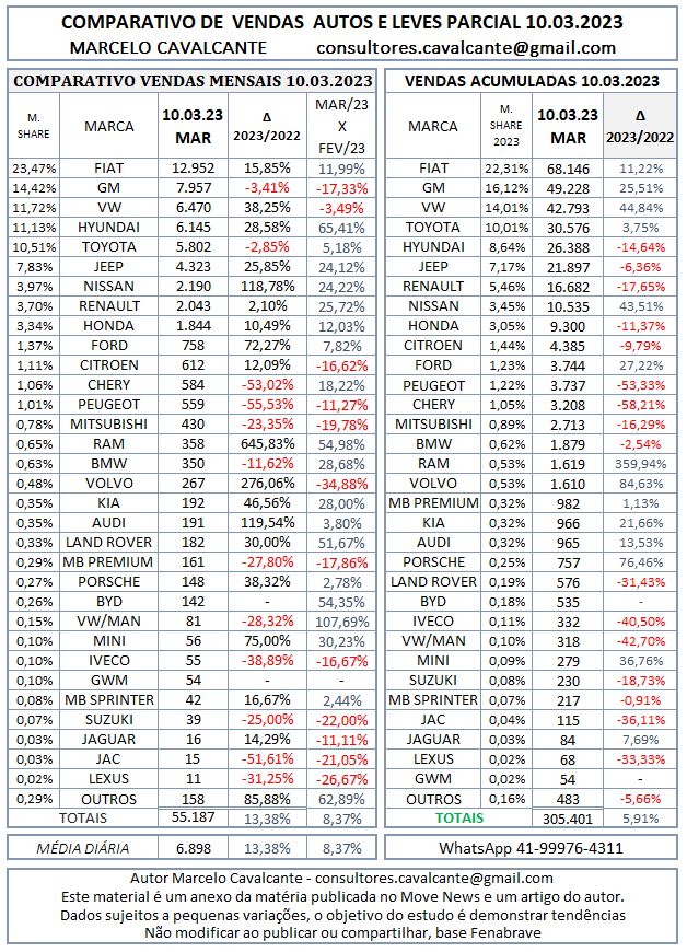 O setor de autos e leves vendeu no primeiro decêndio de março, 55.187 unidades, registrando um crescimento de 13,38% em relação ao mesmo período de 2022 e avançando 8,37% ante o mês anterior.